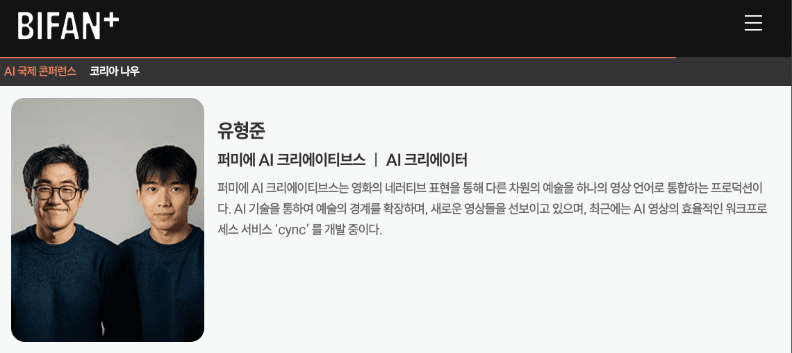 퍼미에 AI 크리에이티브스 소속의 유형준 님이 제29회 부천국제판타스틱영화제(BIFAN) ‘AI STEP₂: EXPAND’ AI 국제 콘퍼런스에서 AI 크리에이터 쇼케이스 연사로 초청받아 발표 및 피칭 세션에 참여합니다.